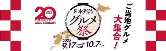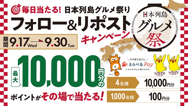 本日より開始!20周年記念第2弾「日本列島グルメ祭」に合わせ、9月17日(水)から9月30日(火)までの2週間、抽選で10,000円分(10,000ポイント)が4名様に、100円分(100ポイント)が1,000名様に、えらべるPay(Pontaポイントまたはdポイントいずれか)が当たります!