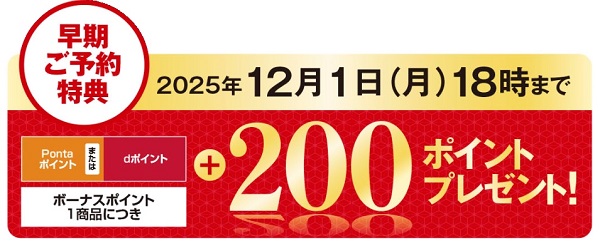 早期予約特典として、12月1日(月)18時までにご予約いただきますと、1商品につきPontaポイントまたはdポイント+200ポイントのボーナスポイントをプレゼントいたします。