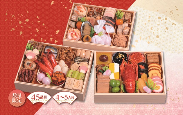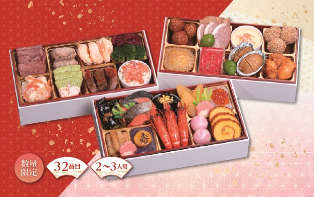 2025年は、2~3人用おせち『「金千華」三段重』と『「華千歳」和洋中三段重』、4~5人用おせち『「天寿千」三段重』の3種類を数量限定でご用意いたしました。ローソンストア100店頭でのお受け取りの他、商品代金+1,500円(税込)で宅配サービスも承ります。