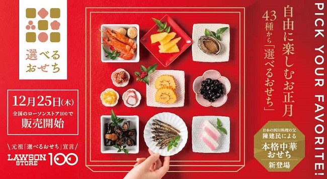 ローソンストア100は、累計約1,950万食突破、定番から高級食材までが少量パックで揃うローソンストア100の看板商品、「ローソンストア100オリジナルおせち」を12月25日(木)より展開します。