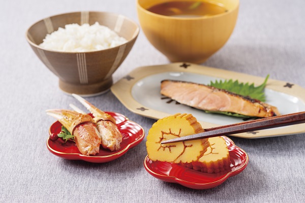 いつもの玉子焼きのかわりに、「伊達巻」を、ちょっぴり贅沢なおかずとして「かに爪」をくわえるだけで、「お正月」の特別感がでてきます。 また、赤いお皿を使用することで、お祝いや開運の意味合いも込められています。