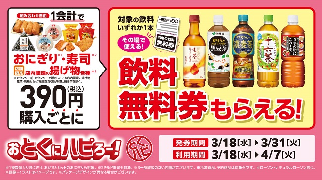 2026年3月18日(水)から3月31日(火)までの2週間、対象の「おにぎり・寿司・ファストフーズ(※)」各種を税込390円ご購入いただくごとに、対象飲料と引き換えできる無料券をプレゼントいたします!
