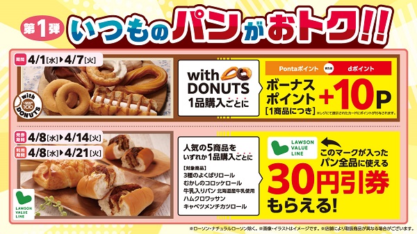 対象のオリジナルパンをいずれか1品購入ごとに、次回のお買い物でVL(LAWSON VALUE LINE) マークが入ったパンに使える30円引きクーポンがレシートについてきます。