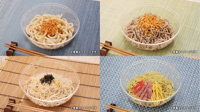 (左上:冷しうどん/右上:冷しそば/左下:冷し素麺/右下:冷し中華)