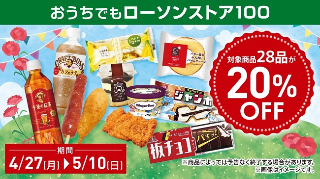 期間中、ローソンストア100の対象商品が20%OFF!ローソンストア100を Uber Eats で大変お得にご利用いただける機会です。皆様からのご注文をお待ちしております。