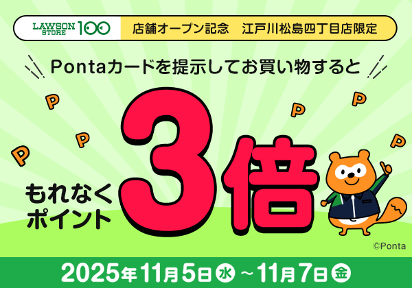 また、11月5日(水)から11月7日(金)の期間中、お会計時にPontaカードを提示するともれなくPontaポイント3倍!