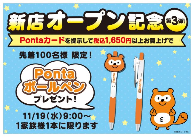 ■ 新店オープン記念第3弾!11月19日(水)よりPontaボールペンを先着100名様限定でプレゼント!