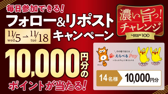 「ローソンストア濃い旨っ!チャレンジ」に合わせ、11月5日(水)から11月18日(火)までの2週間、抽選で毎日必ず1名様に、えらべるPay10,000ポイント(Pontaポイントまたはdポイントいずれか)が当たる、フォロー&リポストキャンペーンを実施します!