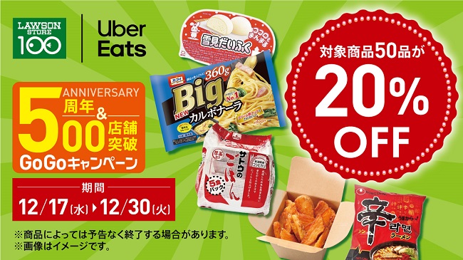 ローソンストア100は12月17日(水)から12月30日(火)まで、Uber Eats 限定で「5周年500店舗突破GoGoキャンペーン」を開催いたします。