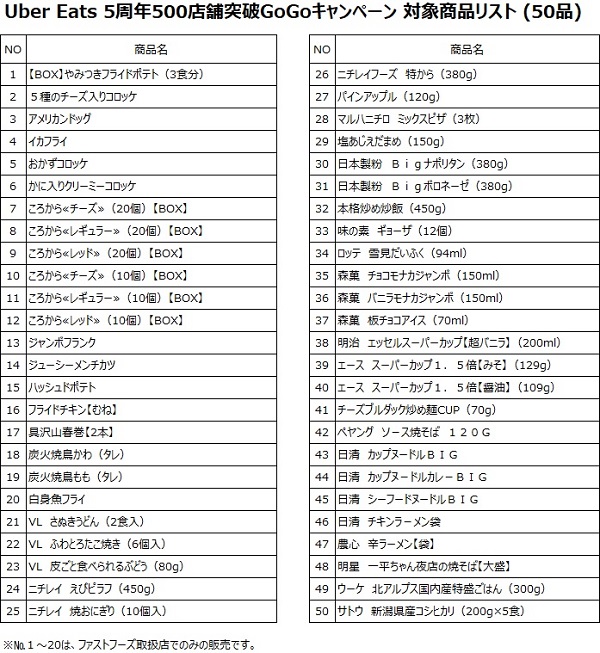・対象商品(50品)が Uber Eats 販売価格(税込)より20%OFF