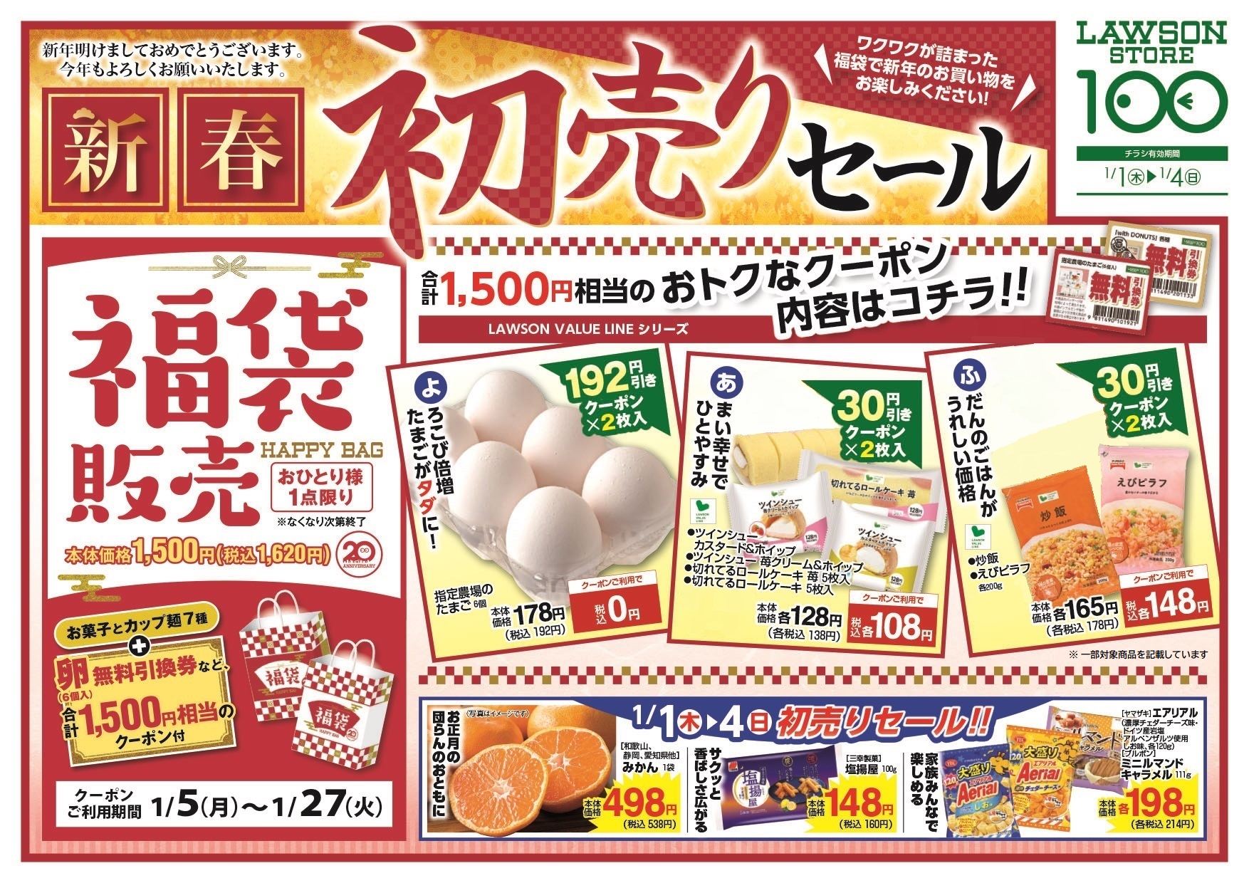 ローソンストア100は、新ストアコンセプト「あたらしい・おいしい・うれしい」の一環として、2026年1月1日(木)0時から、「初売りセール」を開催いたします。期間中は、年始限定のクーポンチラシ入り福袋をはじめ、大容量菓子などのお買い得商品を取り揃え、新年のスタートをお得に応援します。