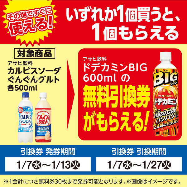 2026年01月07日アサヒ飲料「ドデカミンBIG」がもらえる!おトクなレシートクーポン 1月7日(水)から1月13日(火)まで