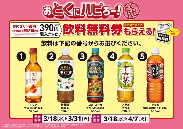 2026年03月11日おにぎり・寿司・ファストフーズを買って、対象の飲料が無料に!春のうれしいキャンペーン 3月18日(水)スタート
