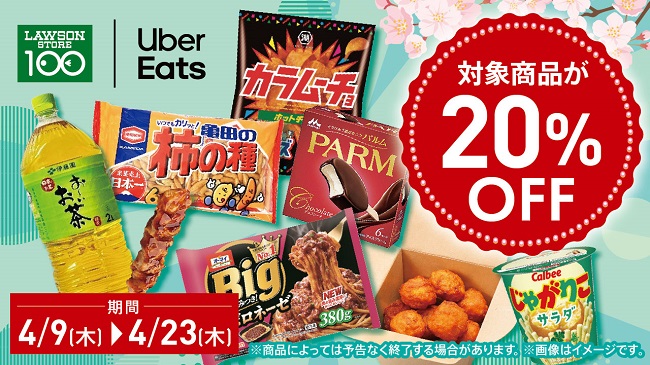 期間中、ローソンストア100の対象商品が20%OFF!ローソンストア100を Uber Eats で大変お得にご利用いただける機会です。皆様からのご注文をお待ちしております。